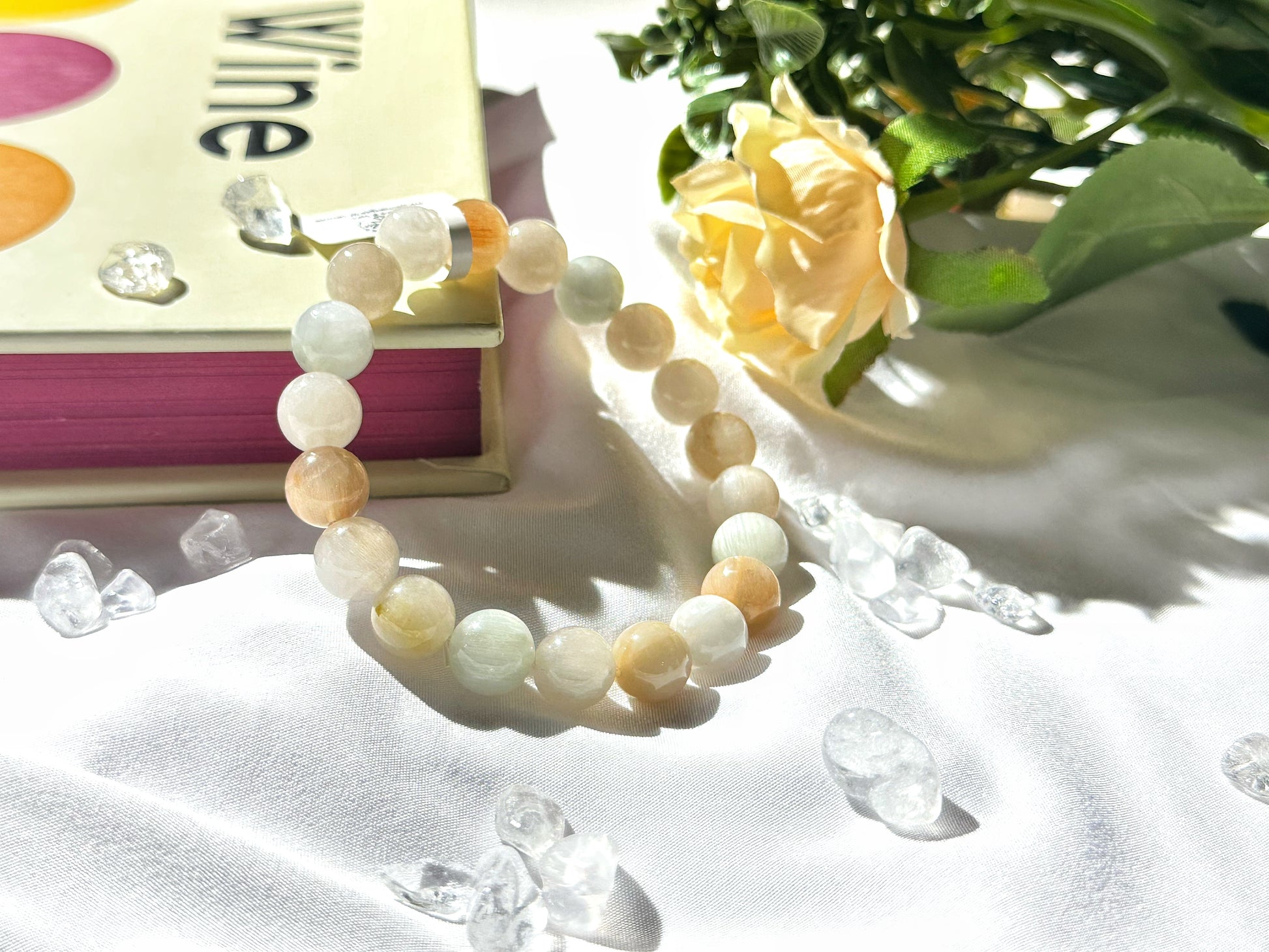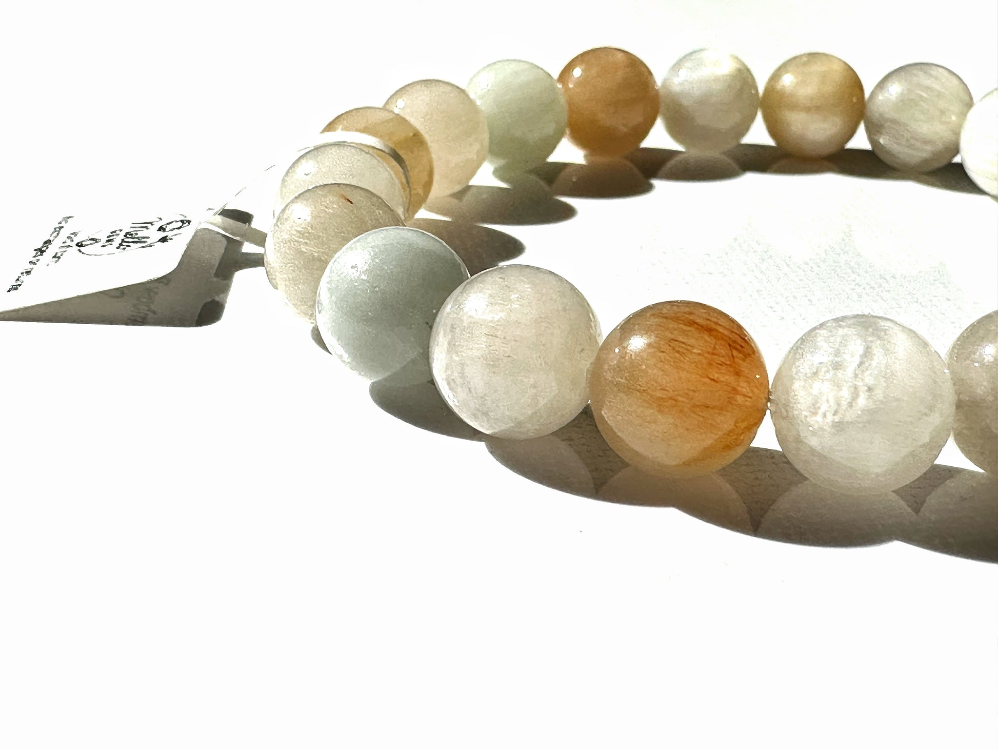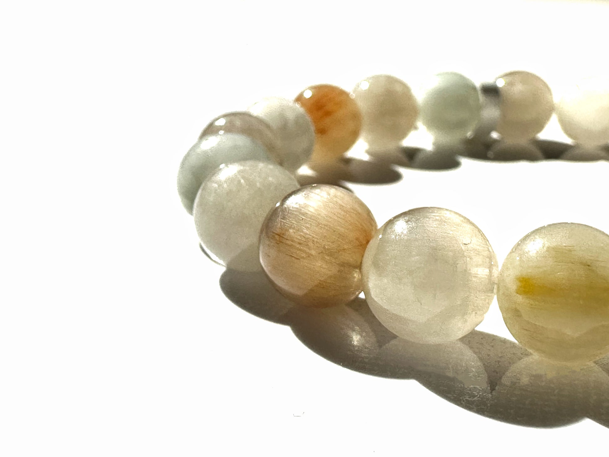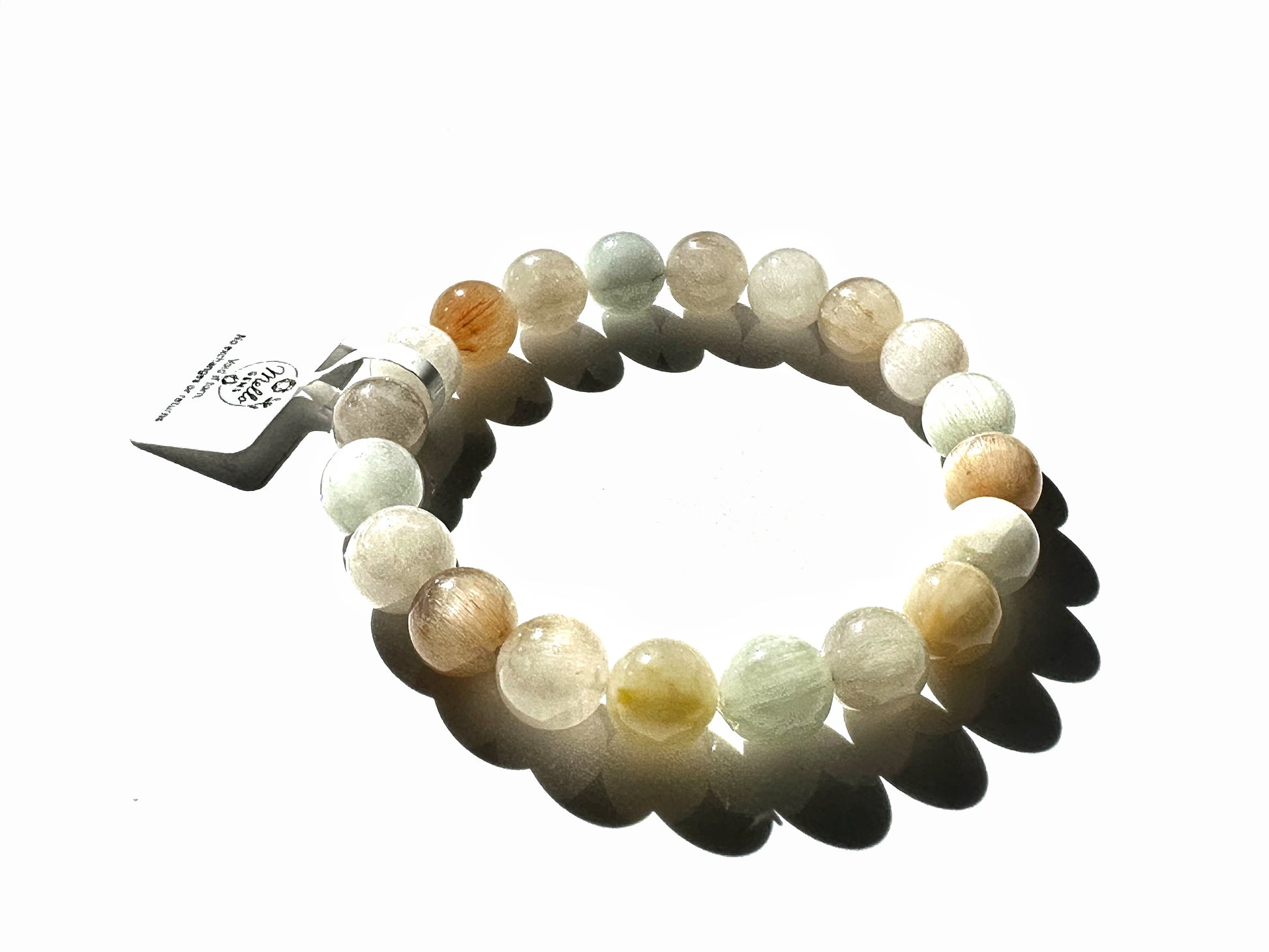 This calming bracelet is crafted with natural premium graded Rabbit Hair Quartz, known for its unique internal fibers and soft, earthy colors. Each bead is subtly different, ranging from warm amber tones to soft whites and greens—perfect for those who seek clarity, peace, and emotional healing.